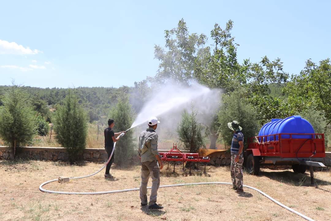 Mahalleli, bahçeler ve hayvanları için kullandıkları su tankerlerini traktörlerinin arkalarına bağlayıp hortum ve tazyikli su sıkma sistemi kurdu. Yangın söndürme arazözlerine dönüştürülen tankerler yangınlara anında müdahale ediliyor.