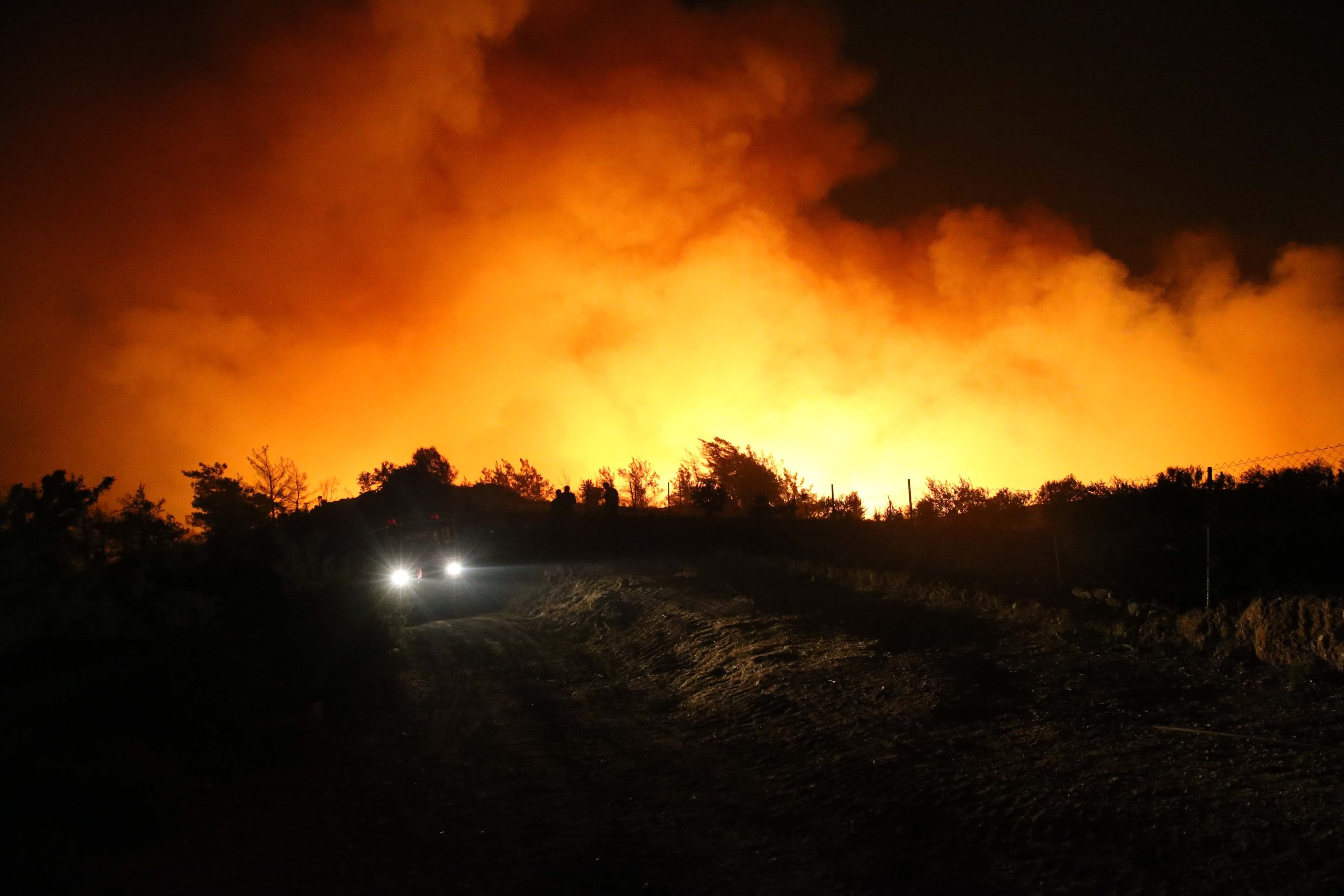 Havanın kararmasıyla yangına, çok sayıda arazöz, itfaiye aracı ve orman işçilerinin yanı sıra jandarmanın TOMA araçları, Yeniköy Kemerköy Elektrik Üretim ve Ticaret AŞ’nin (YK Enerji) iş makinelerince karadan müdahale ediliyor.
